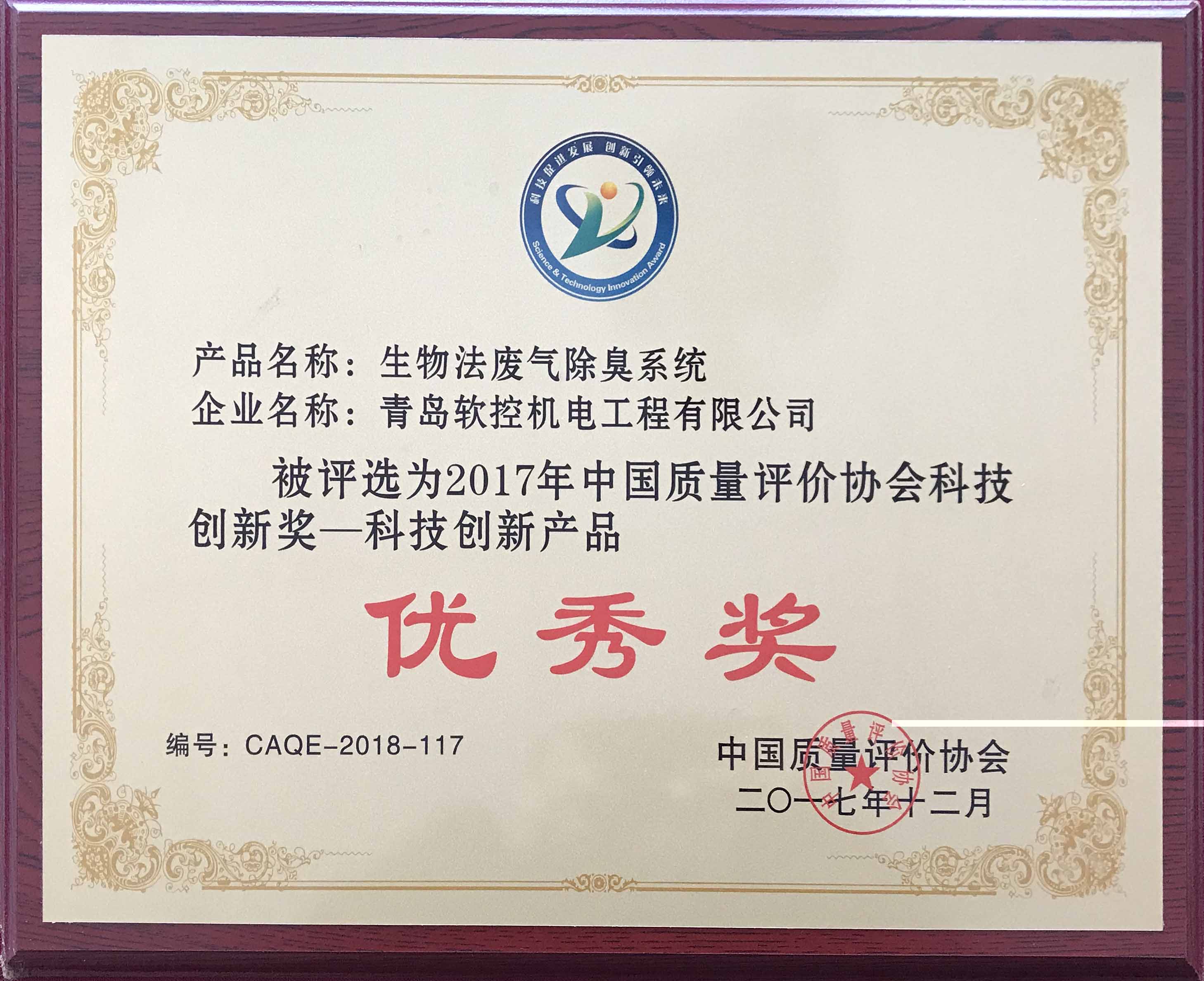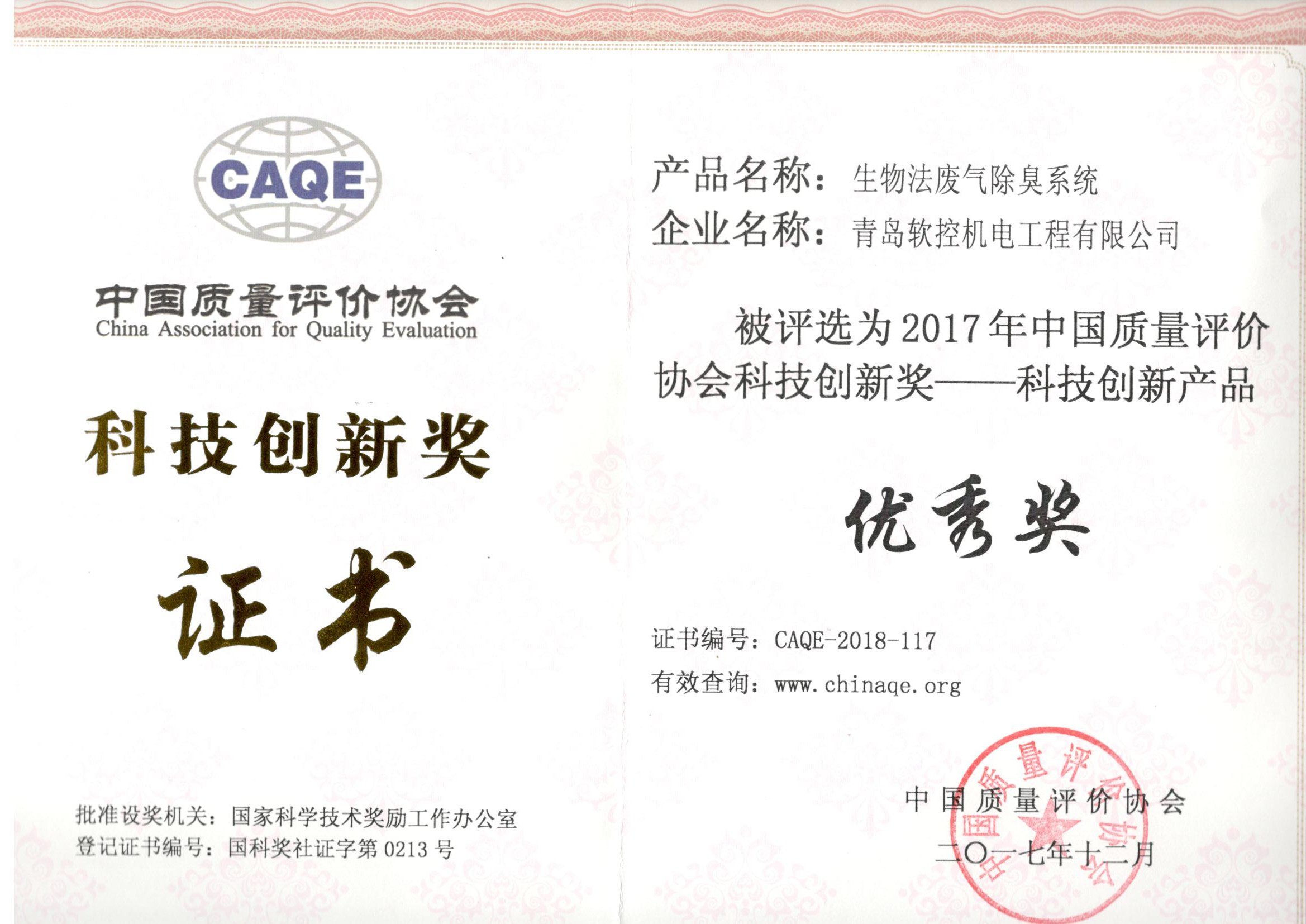 中国质量评价协会科技创新奖证书