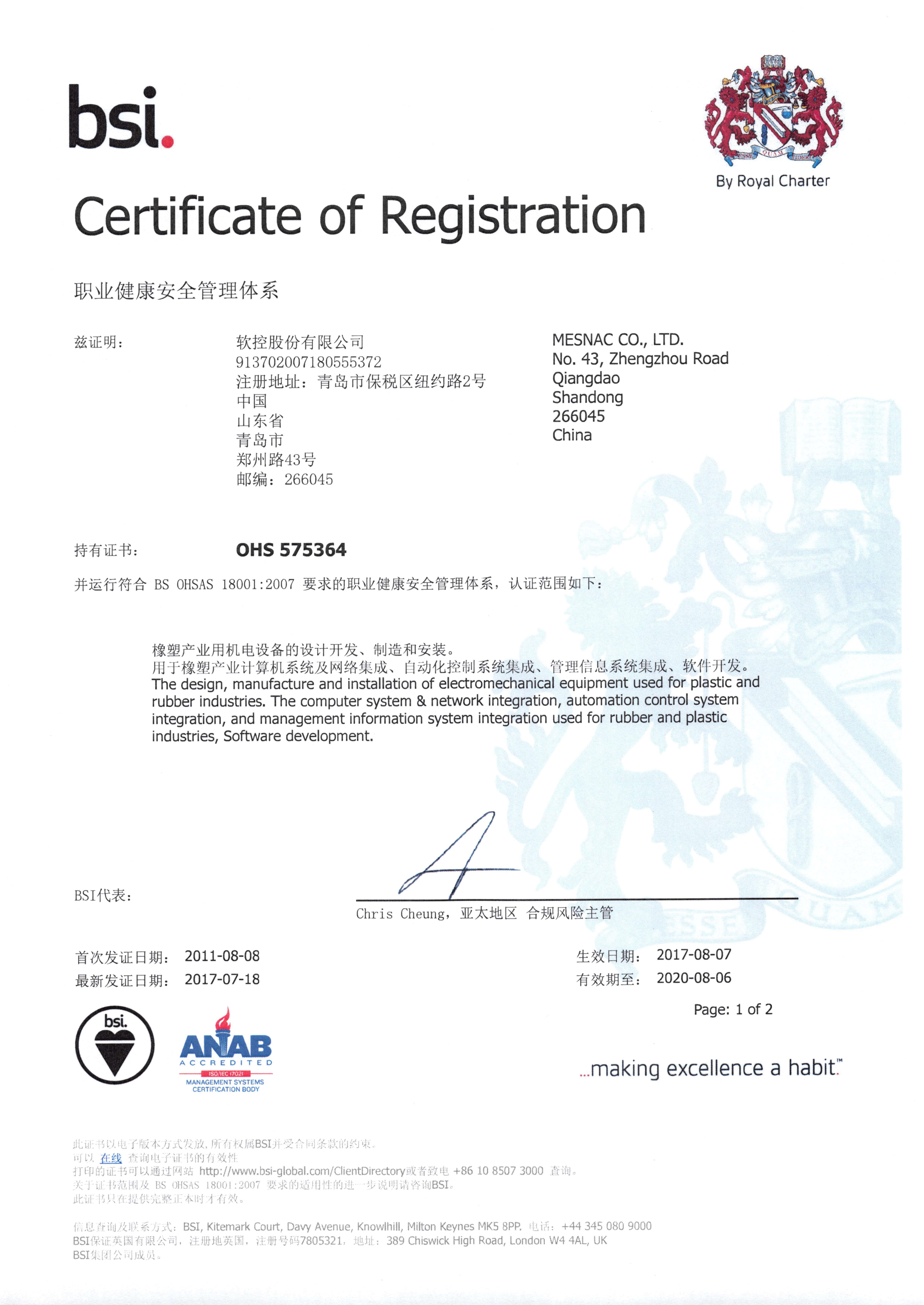 职业健康安全管理体系证书