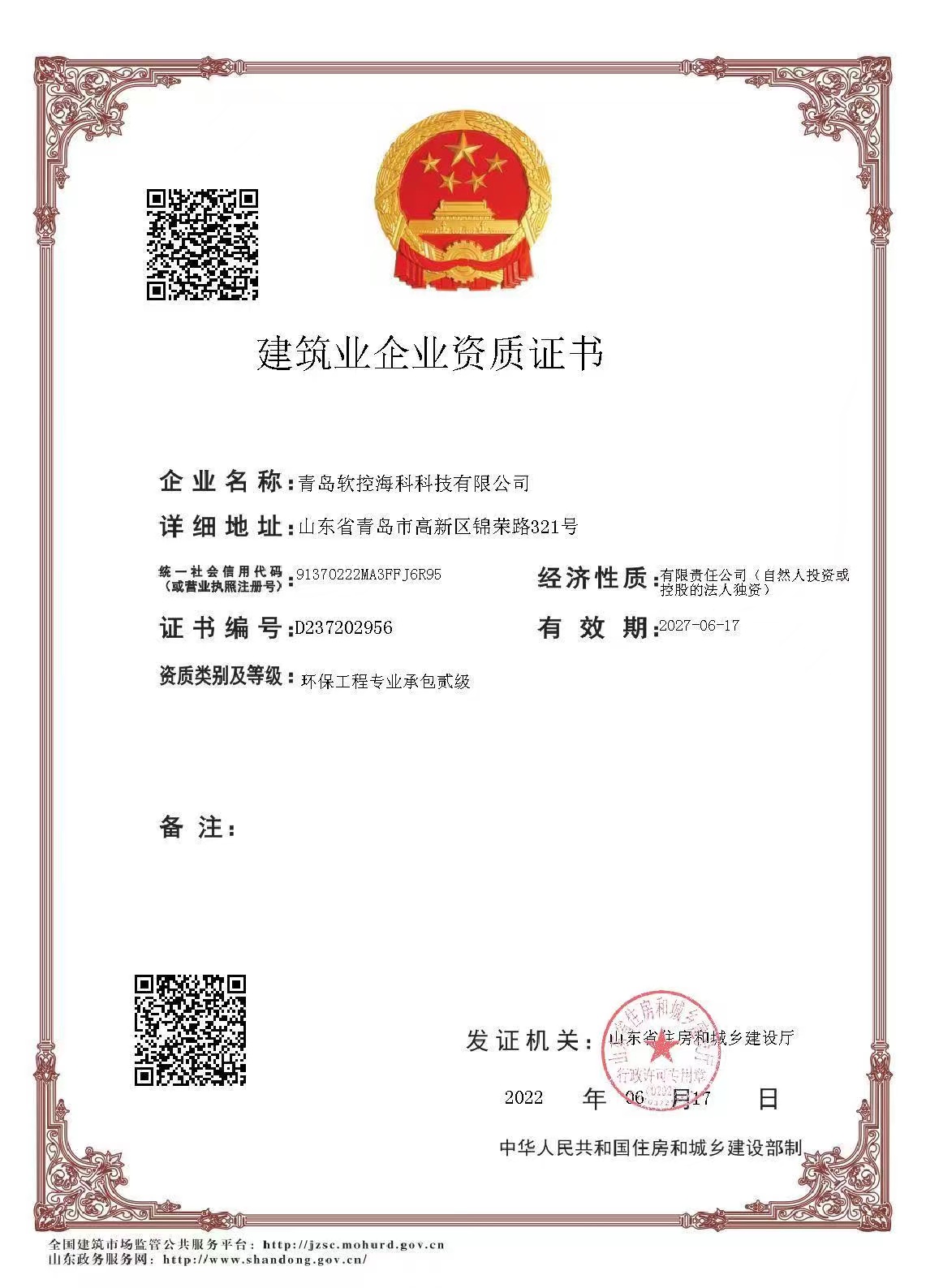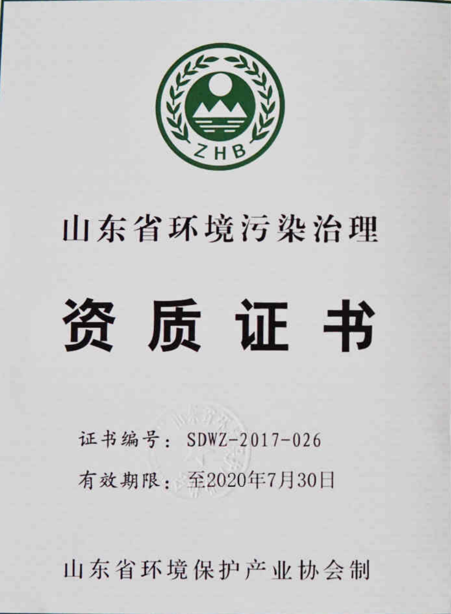 山东省环境污染治理资质证书