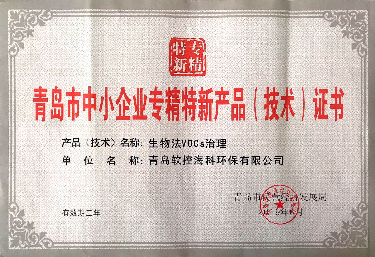 青岛市中小企业专精特新产品(技术)证书